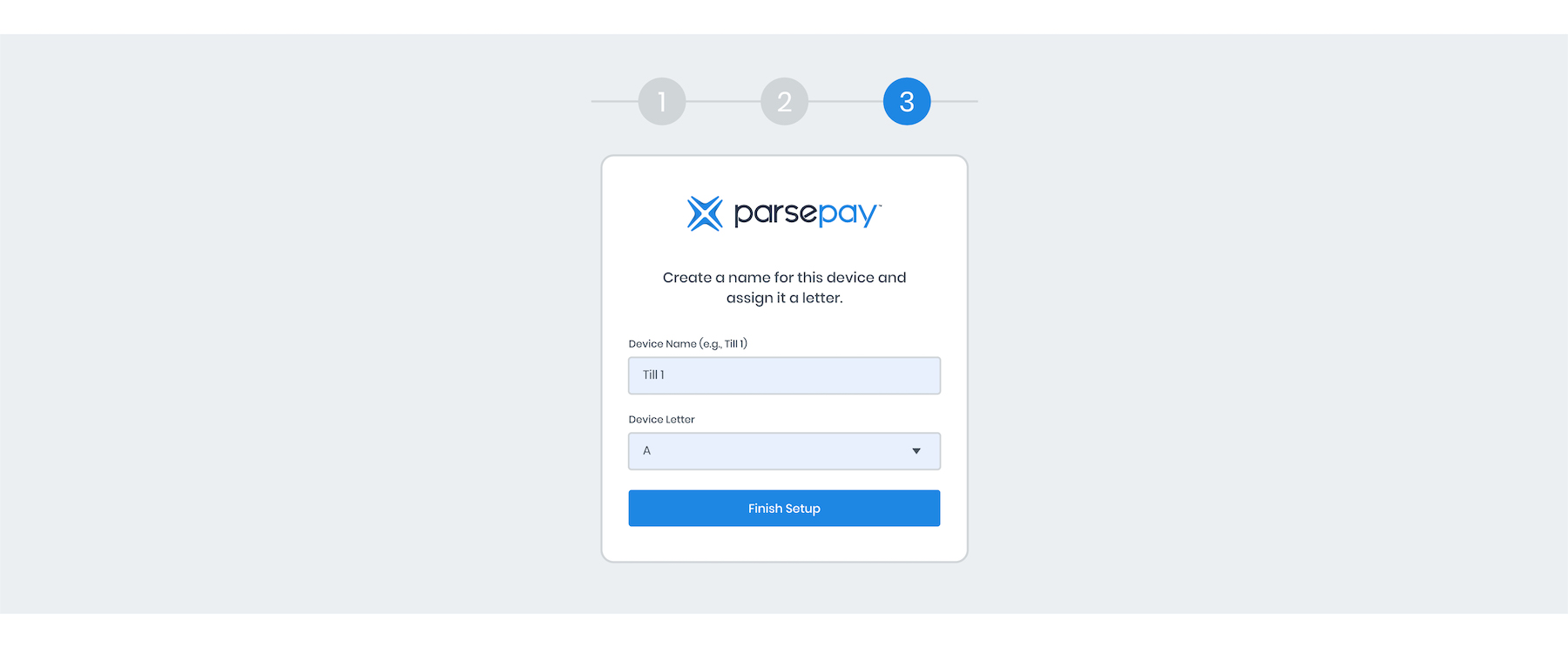 To complete the registration process, create a Device Name for this terminal (e.g., Till 1) and assign it a Device Letter (A-Z) from the drop-down menu.