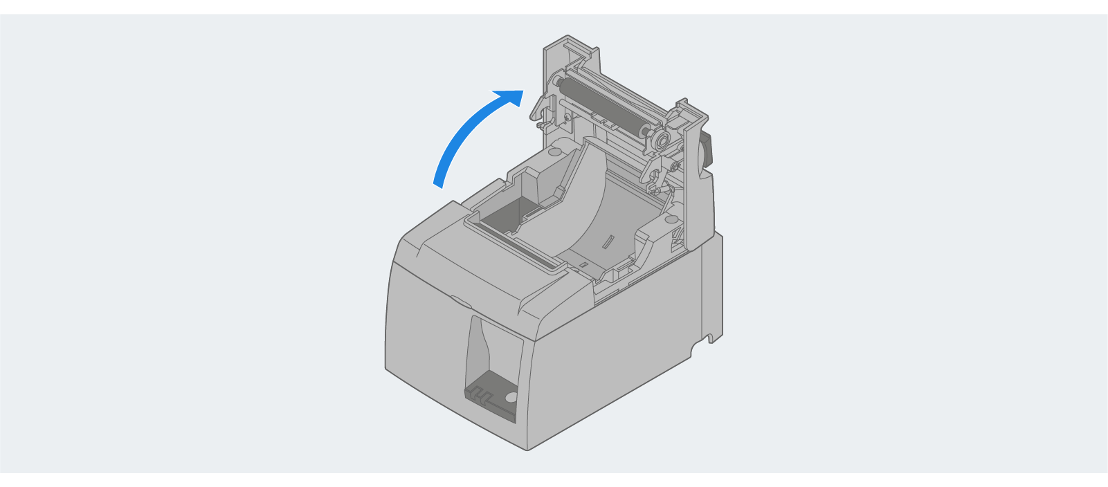 Printer Cover: Needs to be opened via the open lever to load or replace printer receipt paper