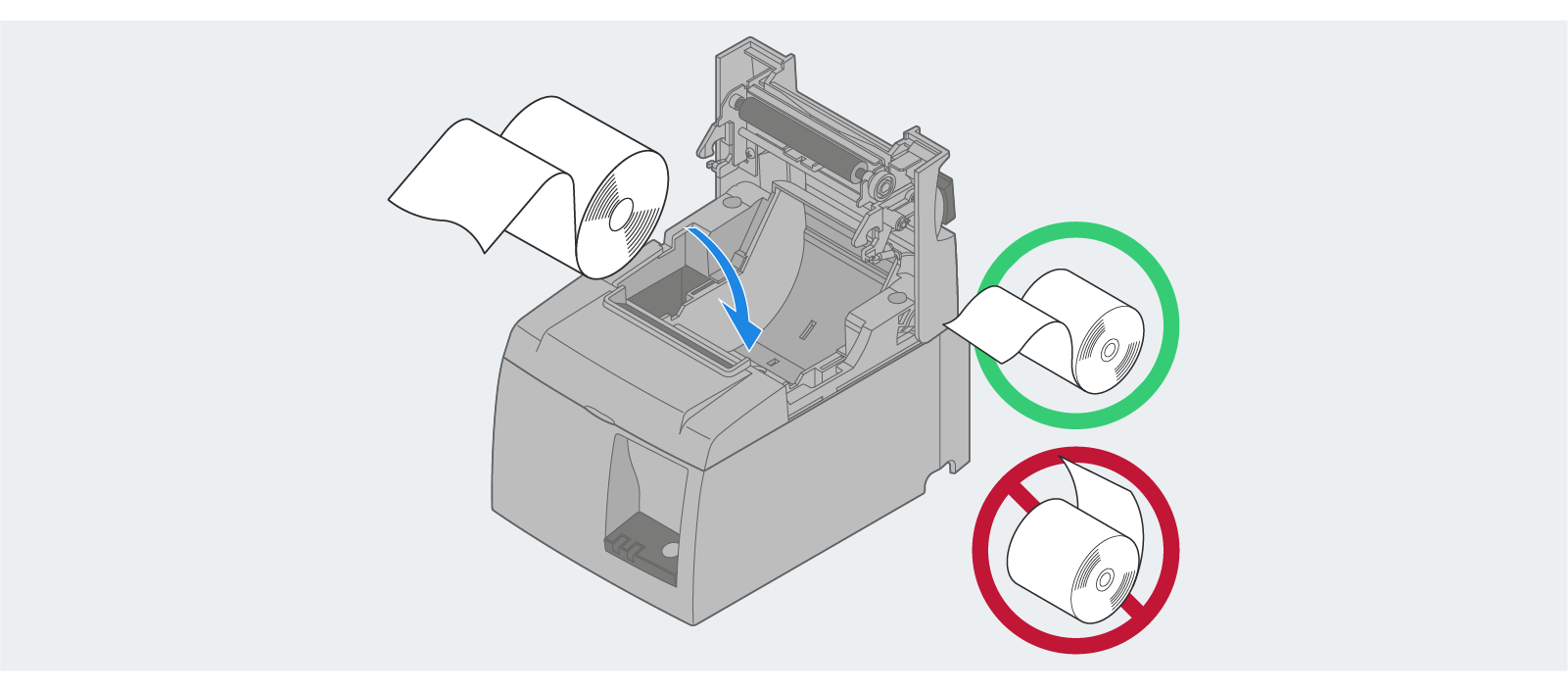 Set the receipt paper into the hallow. Note the correct paper orientation from the picture below.