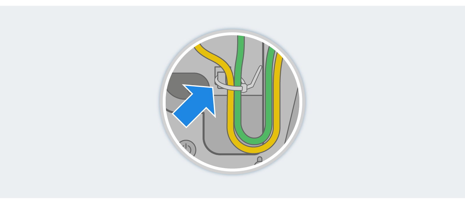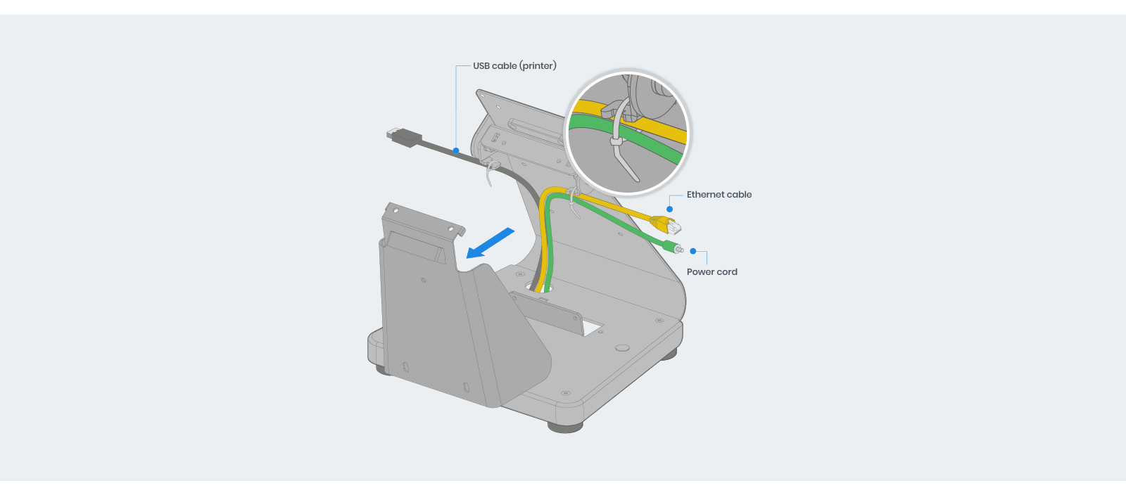 Run the cables through the hole in the base of the stand as shown and secure them to the cord hooks with a cable tie (optional but recommended).